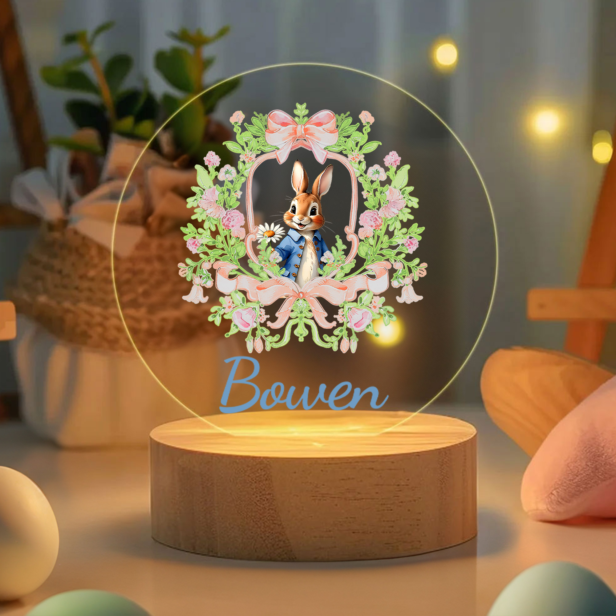 | Stil | Personalisierter Namensrahmen mit Aquarellblumen, Schleife und Hasen-LED-Nachtlicht |