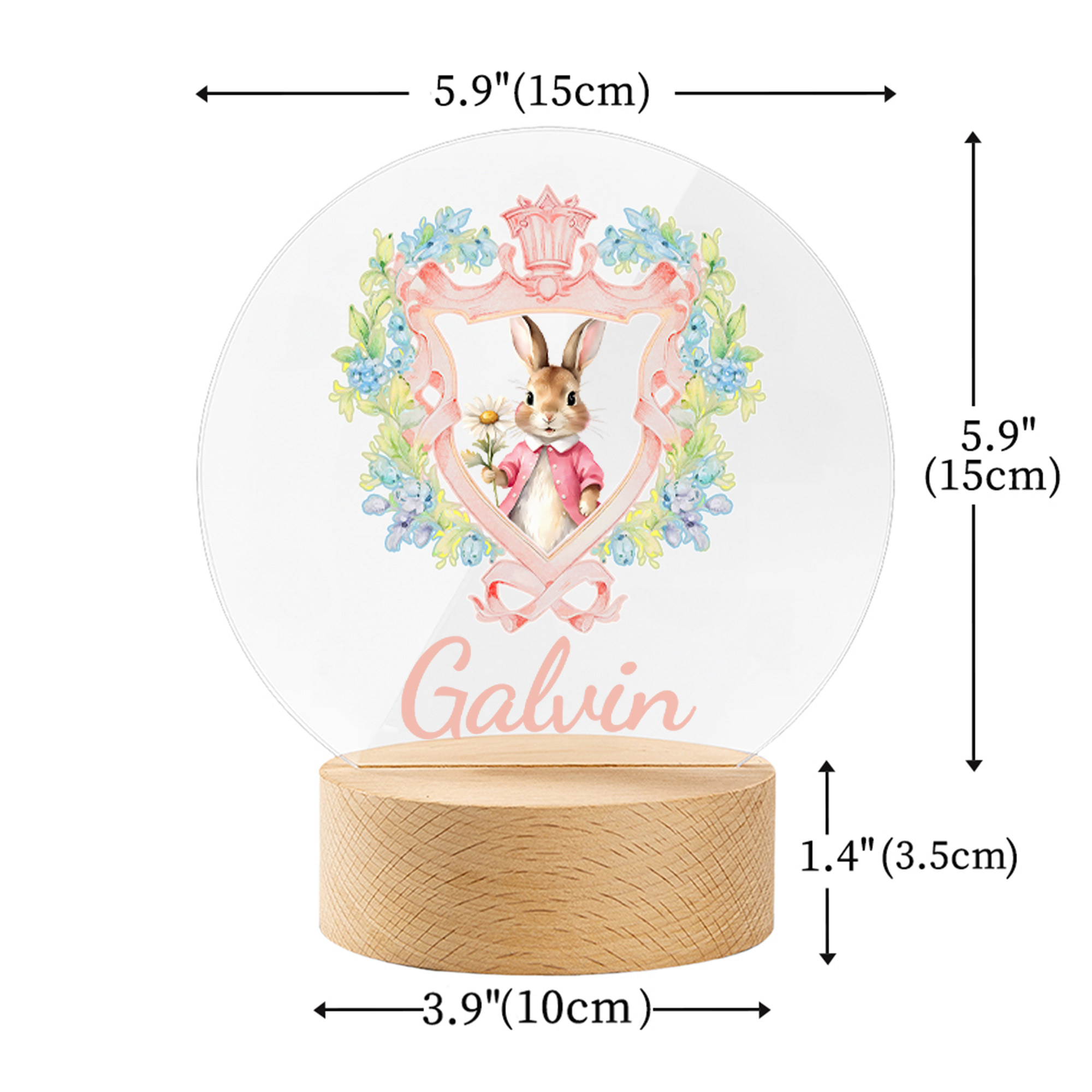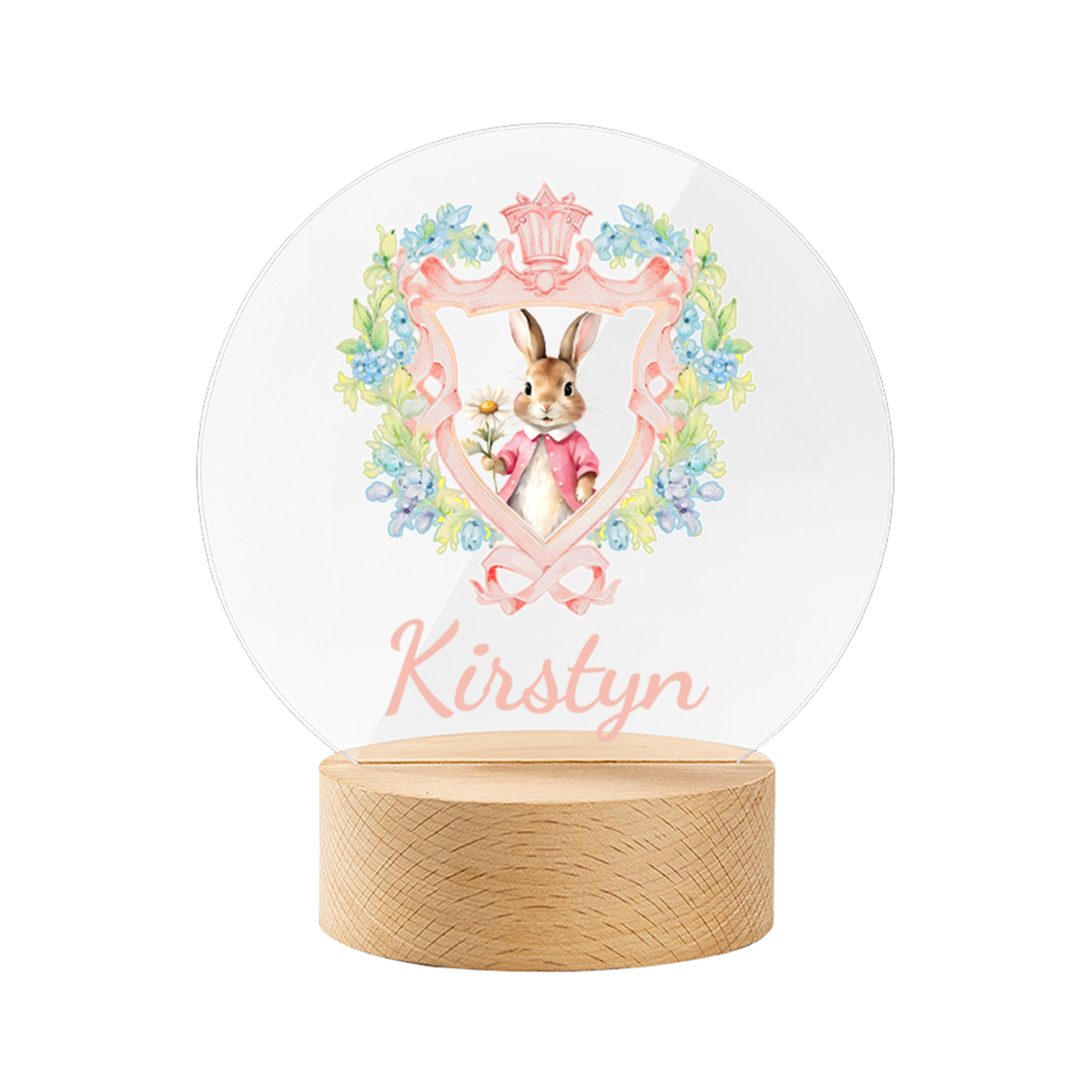 Transparentes Acryl mit Holzsockel – Diese personalisierte Nachtleuchte aus glattem Acryl mit stabilem Holzsockel besticht durch ihr klares, modernes Design. Das sanfte LED-Licht ist angenehm für die Augen, während die pastellfarbenen Blumentöne und das Hasenmotiv für eine niedliche und gemütliche Atmosphäre sorgen.